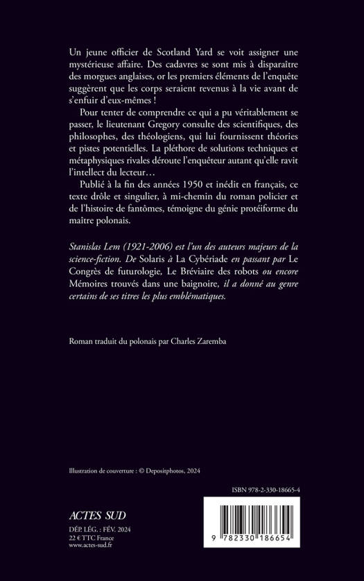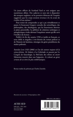 Un jeune officier de Scotland Yard se voit assigner une mystérieuse affaire. Des cadavres se sont mis à disparaître des morgues anglaises, or les premiers éléments de l'enquête suggèrent que les corps seraient revenus à la vie avant de s'enfuir d'eux-mêmes ! Pour tenter de comprendre ce qui a pu véritablement se passer, le lieutenant Gregory consulte des scientifiques, des philosophes, des théologiens, qui lui fournissent théories et pistes potentielles. La pléthore de solutions techniques et métaphysiques rivales déroute l'enquêteur autant qu'elle ravit l'intellect du lecteur... Publié à la fin des années 1950 et inédit en français, ce texte drôle et singulier, à mi-chemin du roman policier et de l'histoire de fantômes, témoigne du génie protéiforme du maître polonais.