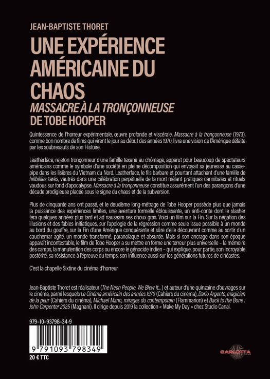 « Voir un film de Tobe Hooper, c’est accepter de fouiller de façon extrême dans les angles morts de notre époque, et parfois de notre enfance, et apprendre que tout ce qu’on enterre finit toujours par refaire surface. » Jean-Baptiste Thoret 50 ans après sa sortie, "Massacre à la tronçonneuse" mérite sans commune mesure son statut de chef-d’oeuvre absolu du cinéma de genre. Film de toutes les expérimentations et de tous les excès, dénonçant à la fois la famille traditionnelle américaine, le « capitalisme cannibale » et les mensonges répétés du gouvernement face à la débâcle de la guerre du Vietnam, Massacre à la tronçonneuse est depuis toujours considéré comme l’oeuvre la plus terrifiante de tous les temps, film culte par excellence, interdit en France pendant de nombreuses années. À travers une analyse prodigieusement riche et fouillée, regroupant étude critique, réflexion sociologique sur l’Amérique des années 1970, témoignages du tournage et des annexes s’intéressant à la censure du film en France, cet ouvrage raconte la genèse du film mythique de Tobe Hooper, éclaire ses ressorts et approfondit avec minutie ses différentes thématiques. Une édition revue et augmentée, accompagnée de photos d’archives.