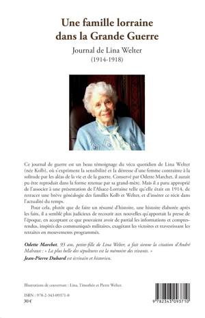 Ce journal de guerre est un beau témoignage du vécu quotidien de Lina Welter (née Kolb), où s'expriment la sensibilité et la détresse d'une femme contrainte à la solitude par les aléas de la vie et de la guerre. Conservé par Odette Marchet, il aurait pu être reproduit sous sa forme originale. Mais il a paru approprié de l'associer à une présentation de l'Alsace-Lorraine telle qu'elle était en 1914, de retracer une brève généalogie et d'insérer ce récit dans l'actualité de l'époque.