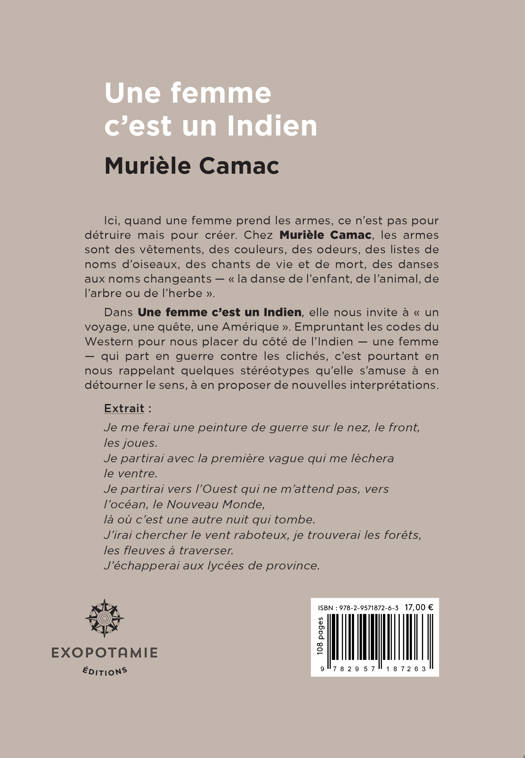 Ici, quand une femme prend les armes, ce n’est pas pour détruire mais pour créer. Chez Murièle Camac, les armes sont des vêtements, des couleurs, des odeurs, des listes de noms d’oiseaux, des chants de vie et de mort, des danses aux noms changeants — « la danse de l’enfant, de l’animal, de l’arbre ou de l’herbe ». Avec ce texte, elle nous invite à « un voyage, une quête, une Amérique ». Empruntant les codes du Western pour nous placer du côté de l’Indien — une femme — qui part en guerre contre les clichés, c’est pourtant en nous rappelant quelques stéréotypes qu’elle s’amuse à en détourner le sens, à en proposer de nouvelles interprétations.