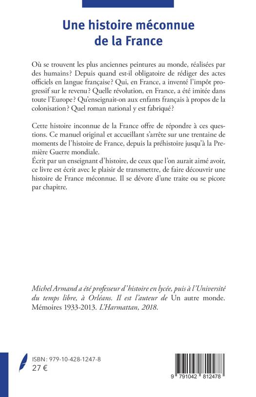Où se trouvent les plus anciennes peintures au monde, réalisées par des humains ? Depuis quand est-il obligatoire de rédiger des actes officiels en langue française ? Qui, en France, a inventé l'impôt progressif sur le revenu ? Quelle révolution, en France, a été imitée dans toute l'Europe ? Qu'enseignait-on aux enfants français à propos de la colonisation ? Quel roman national y est fabriqué ? Cette histoire inconnue de la France offre de répondre à ces questions. Ce manuel original et accueillant s'arrête sur une trentaine de moments de l'histoire de France, depuis la préhistoire jusqu'à la première guerre mondiale. Écrit par un enseignant d'histoire, de ceux que l'on aurait aimé avoir, ce livre est écrit avec le plaisir de transmettre, de faire découvrir une histoire de France méconnue. Il se dévore d'une traite ou se picore par chapitre.