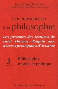 Dans le volume précédent, nous avons étudié ce qui concerne la raison spéculative, que ce soit lorsqu'elle réfléchit sur elle-même, comme dans la Science rationnelle, ou lorsqu'elle étudie les êtres naturels, comme dans les Libri naturales. Or l'une des grandes distinctions introduites par Aristote est celle qui existe entre la raison spéculative, théorétique et la raison pratique, entre une connaissance qui cherche à connaître pour connaître et contempler l'ordre de l'univers, et une connaissance qui se met au service de l'agir moral et politique de l'être humain. Thomas d'Aquin, en commentant l'Ethique à Nicomaque et La Politique d'Aristote, nous livre une étude capitale sur les caractéristiques essentielles de l'agir moral et politique de l'être humain. Et, dans les proèmes de ses commentaires, il présente l'objet et la finalité de la raison pratique morale et politique ainsi que la manière dont on peut considérer les actes moraux et politiques de chaque personne. Si l'on a pu parler de "science morale", il semble nécessaire de lire les deux proèmes de saint Thomas à ses deux commentaires - ainsi que les commentaires qu'il fait de ce qu'il estime être les propres proèmes d'Aristote - pour s'apercevoir que la "science morale" ne peut pas être dite science au même titre que les "sciences" de la nature, qu'une philosophie morale et politique ne peut pas raisonner comme raisonne une philosophie de la nature. C'est donc à la découverte de l'ordre pratique, moral et politique, que ces proèmes de saint Thomas nous invitent. On remarquera qu'on ne sépare pas ce qui concerne la morale et ce qui revient à la "politique", tant il est vrai que la réalité de l'agir humain dépend des intentions, des choix, des décisions personnelles de chacun, mais également d'une participation effective et nécessaire de chaque personne à diverses communautés, et d'abord à la communauté familiale dont il est naturellement une partie. Le bien propre que chacun cherche et désire est toujours relatif à un bien commun, désiré et vécu à plusieurs et pour plusieurs.