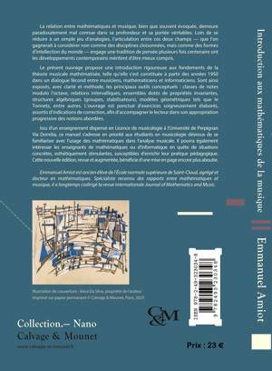 Les rapports entre mathématiques et musique remontent au moins à Pythagore. Le but du présent ouvrage n'est pas d'explorer leurs développements les plus récents et les plus vertigineux, mais, au contraire, de présenter les notions les plus abordables, socle commun des spécialistes mais peu souvent rassemblées dans un même texte en français. Le contenu a été élaboré et testé pour le public de la licence de musicologie de l'Université de Perpignan, lequel n'était pas tenu de posséder la moindre culture mathématique. L'objectif est de proposer un bagage minimal permettant de comprendre quelque chose à ce qui se fait actuellement dans le domaine, voire d'aborder la lecture d'articles de recherche ou création contemporaine avec le confort de connaître les concepts requis : une culture humaniste et les bases pour aller plus loin. L'auteur a l'ambition de dépasser les nombreuses ressources de vulgarisation existantes, en veillant à préserver précieusement la généralité et la structure des vraies définitions mathématiques.