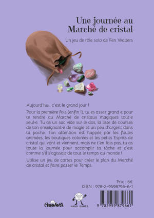 Aujourd'hui, c'est le grand jour ! Pour la première fois (enfin !), tu es assez grand·e pour te rendre au Marché de cristaux magiques tout·e seul·e. Tu as un sac vide sur le dos, la liste de courses de ton enseignant·e de magie et un peu d'argent dans ta poche. Ton attention est happée par les foules animées, les boutiques colorées et les petits Esprits de cristal qui vont et viennent, mais ne t’en fais pas, tu as toute la journée pour accomplir ta tâche et c’est comme s’il s’agissait de tout le temps au monde ! Utilise un jeu de cartes pour créer le plan du Marché de cristal et faire passer le Temps.