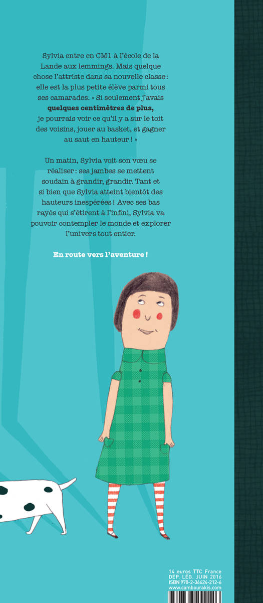 Sylvia souffre de sa petite taille jusqu'à ce qu'un beau jour, ses jambes grandissent, grandissent... Débarrassée de son complexe, la jeune fille va découvrir la vie autrement.... en prenant de la hauteur ! Dernier tome de la série, ce dernier épisode des aventures de Sylvia Lespiègle est une réflexion poétique et joyeuse sur la difficulté de trouver sa place, où l'on retrouve les dessins délicats de l'artiste finlandaise Marika Maijala.