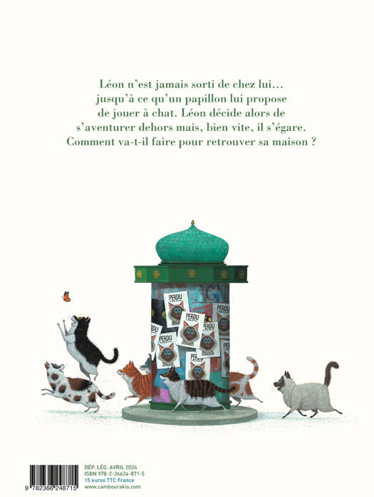 Léon n'est jamais sorti de chez lui... jusqu'à ce qu'un papillon lui propose de jouer à chat. Léon décide alors de s'aventurer dehors mais, bien vite, il s'égare. Comment va-t-il faire pour retrouver sa maison ?
