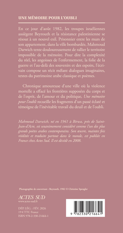 En ce jour d'août 1982, les troupes israéliennes assiègent Beyrouth et la résistance palestinienne se résout à un nouvel exil. Prisonnier entre les murs de son appartement, dans la ville bombardée, Mahmoud Darwich tente douloureusement de rallier le territoire impossible de la mémoire. Pour dire la complexité du réel, les angoisses de l'enfermement, la folie de la guerre et l'au- delà des souvenirs et des espoirs, l'écrivain compose un récit mêlant dialogues imaginaires, textes du patrimoine arabe classique et poèmes. Chronique amoureuse d'une ville où la violence mortelle a effacé les frontières supposées du corps et de l'esprit, de l'amour et du politique, "Une mémoire pour l'oubli" recueille les fragments d'un passé éclaté et témoigne de l'inévitable travail du deuil et de l'oubli.