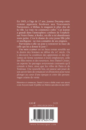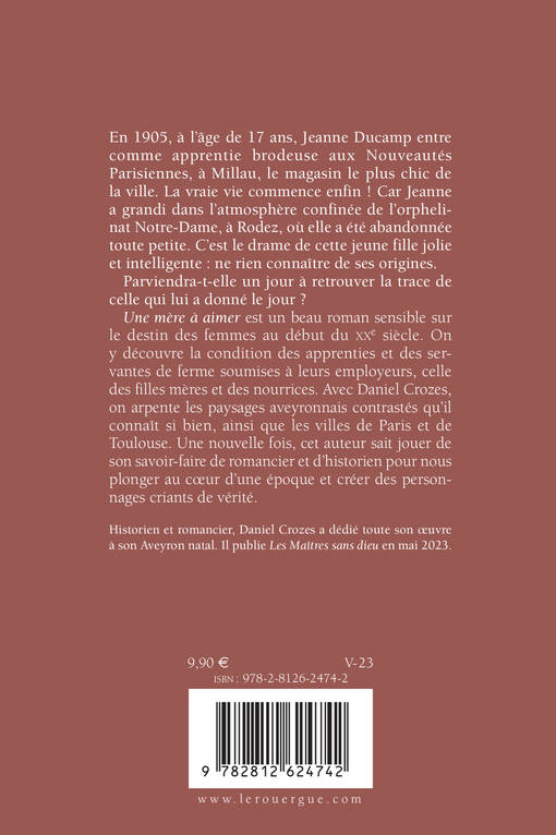En 1905, à l'âge de 17 ans, Jeanne Ducamp entre comme apprentie brodeuse aux Nouveautés Parisiennes, à Millau, le magasin le plus chic de la ville. La vraie vie commence enfin ! Car Jeanne a grandi dans l'atmosphère confinée de l'orphelinat Notre-Dame, à Rodez, où elle a été abandonnée toute petite. C'est le drame de cette jeune fille jolie et intelligente : ne rien connaître de ses origines. Parviendra-t-elle un jour à retrouver la trace de celle qui lui a donné le jour ? Une mère à aimer est un beau roman sensible sur le destin des femmes au début du XXe siècle. On y découvre la condition des apprenties et des servantes de ferme soumises à leurs employeurs, celle des filles mères et des nourrices. Avec Daniel Crozes, on arpente les paysages aveyronnais contrastés qu'il connaît si bien, ainsi que les villes de Paris et de Toulouse. Une nouvelle fois, cet auteur sait jouer de son sa- voir-faire de romancier et d'historien pour nous plonger au coeur d'une époque et créer des personnages criants de vérité.