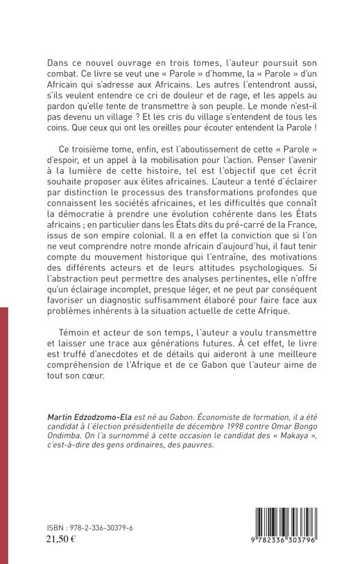 Ce troisième tome, enfin, est l'aboutissement de cette « parole » d'espoir, et un appel à la mobilisation pour l'action. Penser l'aventure à la lumière de cette histoire, tel est l'objectif que cet écrit souhaite proposer aux élites africaines. Témoin et acteur de son temps, l'auteur a voulu transmettre et laisser une trace aux générations futures. A cet effet, le livre est truffé d'anecdotes et de détails qui aideront à une meilleure compréhension de l'Afrique et de ce Gabon que l'auteur aime de tout son coeur.