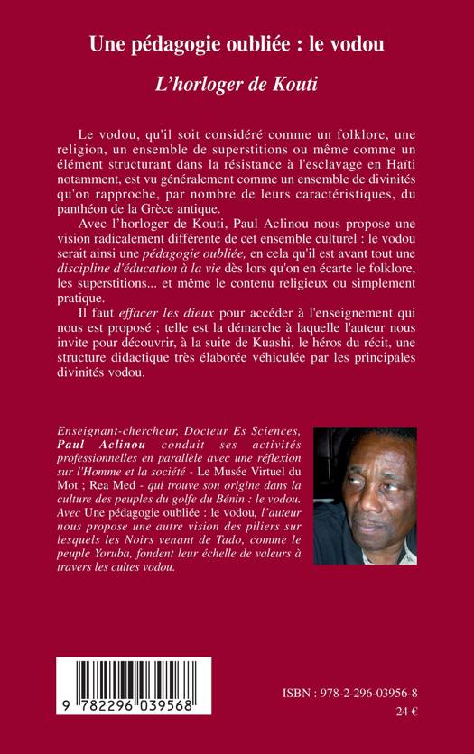 Avec L'horloger de Kouti, Paul Aclinou nous propose une vision particulière de l'ensemble culturel que représente le vodou: il serait ainsi une pédagogie oubliée, en cela qu'il est avant tout une discipline d'éducation à la vie dès lors qu'on écarte le folklore, les superstitions... et même le contenu religieux ou simplement pratique. Il faut effacer les dieux pour accéder à l'enseignement qui nous est proposé.