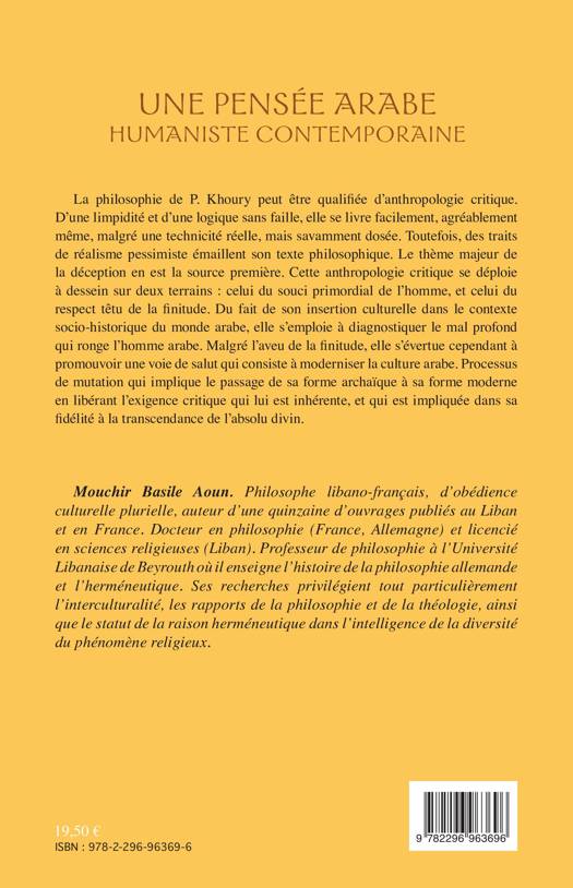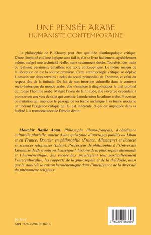 L'oeuvre de Paul Khoury se dessine sur une toile de fond résolument humaniste. Sa philosophie peut être qualifiée d'anthropologie critique ; elle se déploie sur deux terrains : le souci primordial de l'homme et le respect têtu de la finitude. Insérée dans le contexte socio-historique du monde arabe, elle s'évertue, malgré l'aveu de la finitude, à promouvoir une voie de salut qui consiste à moderniser la culture arabe.
