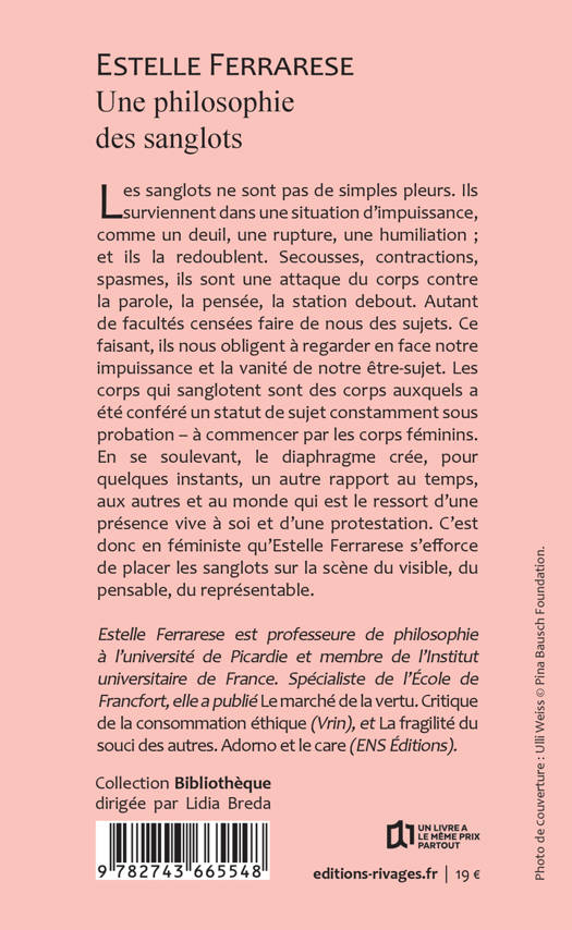 Il existe des choses sur les larmes, mais rien sur les sanglots, qui sont une attaque du corps contre toutes les facultés (la parole, la pensée, la station debout) qui font de nous de nous des sujets. Les sanglots surviennent en général dans une situation d'impuissance (deuil, rupture, etc.), et le corps redouble cette impuissance en neutralisant ces facultés. Ce faisant, ils nous obligent à la regarder en face, cette impuissance, et la vanité de notre être sujet. Les corps qui sanglotent souvent sont des corps auxquels a été conféré d'office un statut de sujet qui est en même temps empêché, provisoire, conditionnel, sous probation.