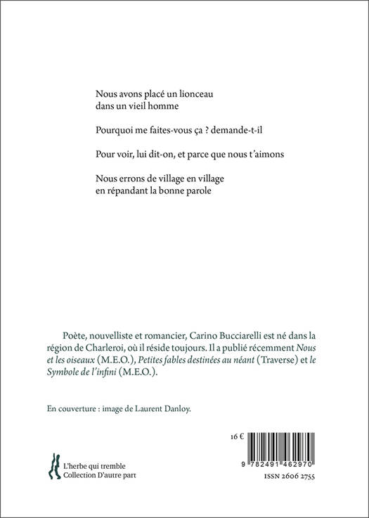 Les poèmes brefs de Carino Bucciarelli adoptent fréquemment une forme narrative. Ils se déploient dans un monde instable et déroutant où les vivants et les choses sont à la fois eux-mêmes et autres. Les rencontres, les dialogues, les péripéties de l’existence ordinaire y prennent l’allure d’un mauvais rêve, empli de menaces sourdes, de cérémonials incompréhensibles. L’ensemble respire une inquiétante et fascinante étrangeté, souvent empreinte d’humour noir et d’un curieux détachement dans l’absurde.