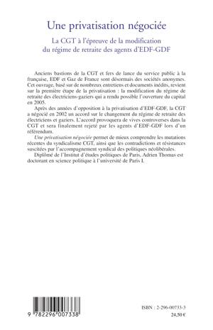 Cet ouvrage, basé sur de nombreux entretiens et documents inédits, revient sur la première étape de la privatisation d'EDF et de Gaz de France. Après des années d'opposition à la privatisation, la CGT a négocié en 2002 un accord sur le changement du régime de retraite, provoquant de vives controverses dans la CGT et finalement rejeté par les agents lors d'un référendum. Ce livre éclaire les mutations récentes du syndicalisme CGT, ainsi que les contradictions et résistances suscitées par l'accompagnement syndical des politiques néolibérales.