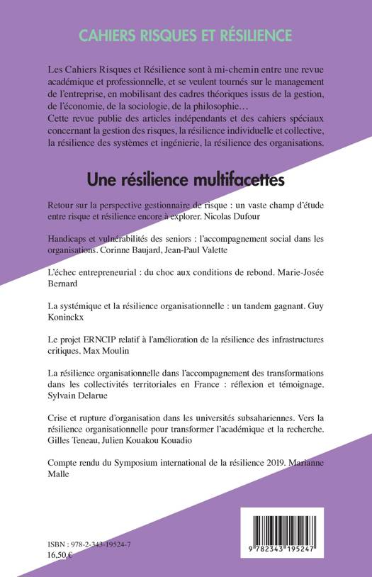 Les Cahiers Risques et Résilience sont à mi-chemin entre une revue académique et professionnelle, et se veulent tournés sur le management de l'entreprise, en mobilisant des cadres théoriques issus de la gestion, de l'économie, de la sociologie, de la philosophie... Cette revue publie des articles indépendants et des cahiers spéciaux concernant la gestion des risques, la résilience individuelle et collective, la résilience des systèmes et ingénierie, la résilience des organisations.