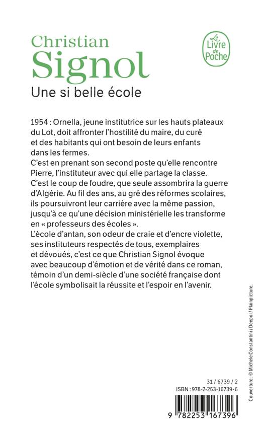 1954 : Ornella, jeune institutrice sur les hauts plateaux du Lot, doit affronter l’hostilité du maire, du curé et des habitants qui ont besoin de leurs enfants dans les fermes. C’est en prenant son second poste qu’elle rencontre Pierre, l’instituteur avec qui elle partage la classe. Entre ces deux enseignants issus de milieux différents mais qui ne vivent que pour leur métier, c’est le coup de foudre que seule assombrira la guerre d’Algérie. Au fil des ans, au gré des réformes scolaires, ils poursuivront leur carrière avec la même passion, jusqu’à ce qu’une décision ministérielle les transforme en « professeurs des écoles ». L’école d’antan, son odeur de craie et d’encre violette, ses instituteurs héritiers des hussards de la Troisième République, respectés de tous, exemplaires et dévoués, c’est ce que Christian Signol évoque avec beaucoup d’émotion et de vérité dans ce roman, témoin d’un demi-siècle d’une société française dont l’école symbolisait la réussite et l’espoir en l’avenir.