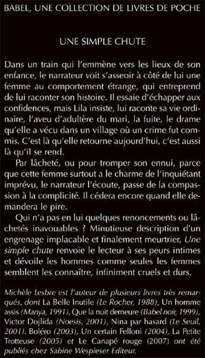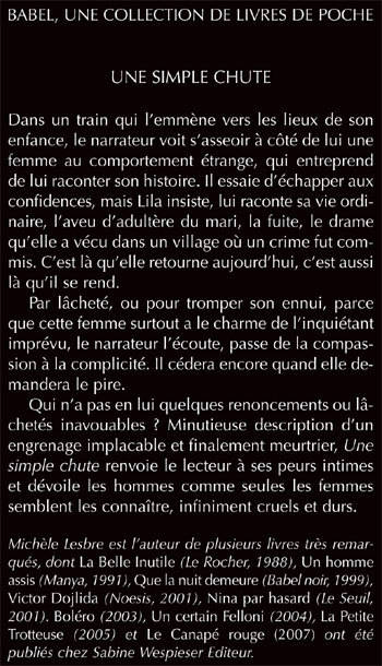 UNE SIMPLE CHUTE Dans un train qui l'emmène vers les lieux de son enfance, le narrateur voit s'asseoir à côté de lui une femme au comportement étrange, qui entreprend de lui raconter son histoire. Il essaie d'échapper aux confidences, mais Lila insiste, lui raconte sa vie ordinaire, l'aveu d'adultère du mari, la fuite, le drame qu'elle a vécu dans un village où un crime fut commis. C'est là qu'elle retourne aujourd'hui, c'est aussi là qu'il se rend. Par lâcheté, ou pour tromper son ennui, parce que cette femme surtout a le charme de l'inquiétant imprévu, le narrateur l'écoute, passe de la compassion à la complicité. Il cédera encore quand elle demandera le pire. Qui n'a pas en lui quelques renoncements ou lâchetés inavouables ? Minutieuse description d'un engrenage implacable et finalement meurtrier, Une simple chute renvoie le lecteur à ses peurs intimes et dévoile les hommes comme seules les femmes semblent les connaître, infiniment cruels et durs. Michèle Lesbre est l'auteur de plusieurs livres très remarqués, dont La Belle Inutile (Le Rocher, 1988), Un homme assis (Manya, 1991), Que la nuit demeure (Babel noir, 1999), Victor Dojlida (Noesis, 2001) , Nina par hasard (Le Seuil, 2001). Boléro (2003), Un certain Felloni (2004), La Petite Trotteuse (2005) et Le Canapé rouge (2007) ont été publiés chez Sabine Wespieser Editeur.