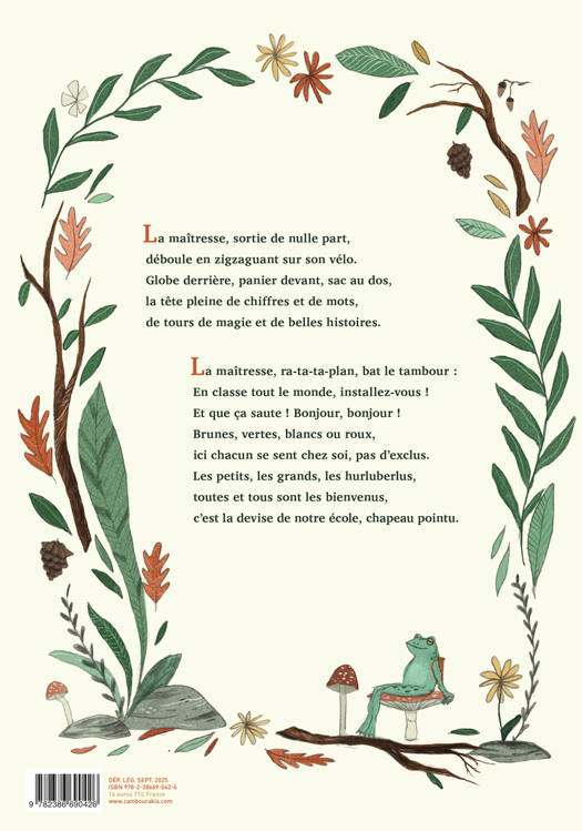 La maîtresse, sortie de nulle part, déboule en zigzaguant sur son vélo. Globe derrière, panier devant, sac au dos, la tête pleine de chiffres et de mots, de tours de magie et de belles histoires. La maîtresse, ra-ta-ta-plan, bat le tambour : En classe tout le monde, installez-vous ! Et que ça saute ! Bonjour, bonjour ! Brunes, vertes, blancs ou roux, ici chacun se sent chez soi, pas d'exclus. Les petits, les grands, les hurluberlus, toutes et tous sont les bienvenus, c'est la devise de notre école, chapeau pointu.