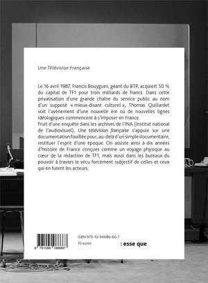 Notre histoire se situe à un moment précis, celui de la privatisation de TF1. Le rachat de la chaîne par Francis Bouygues va transformer profondément la manière de faire de l’information. Il va renouveler le traitement de la politique, réinventer les formats des programmes et faire du plateau du 20h le passage obligé des grands de ce monde. Il le transforme en usine à souvenir pour nous, spectateurs : La chute du mur, les élections présidentielles, la guerre du Golfe, la mort de Bérégovoy… autant de moments gravés dans nos mémoires, dont nous ignorons comment le traitement a été pensé en interne. Ce sont ces rouages, par le biais de la fiction, que nous allons tenter de mettre en lumière. La pièce écrite par Thomas Quillardet comporte une part de théâtre documentaire, de reconstitution mais aussi des souvenirs plus personnels. Une Télévision française se construit sur un va-et-vient entre des consciences intimes qui s’ouvrent et un rachat qui, au long des années, va imprimer et changer radicalement les consciences françaises.
