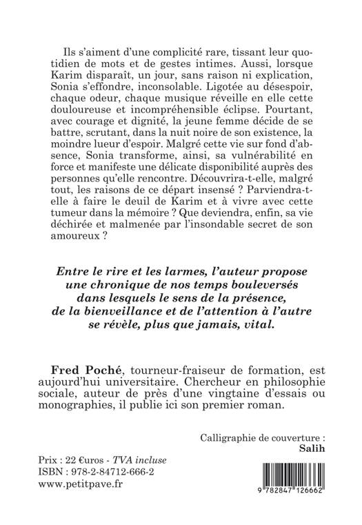 Ils s'aiment d'une complicité rare, tissant leur quotidien de mots et de gestes intimes. Aussi, lorsque Karim disparaît, un jour, sans raison ni explication, Sonia s'effondre, inconsolable. Ligotée au désespoir, chaque odeur, chaque musique réveille en elle cette douloureuse et incompréhensible éclipse. Pourtant, avec courage et dignité, la jeune femme décide de se battre, scrutant, dans la nuit noire de son existence, la moindre lueur d'espoir. Malgré cette vie sur fond d'absence, Sonia transforme, ainsi, sa vulnérabilité en force et manifeste une délicate disponibilité auprès des personnes qu'elle rencontre. Découvrira-t-elle, malgré tout, les raisons de ce départ insensé ? Parviendra-t-elle à faire le deuil de Karim et à vivre avec cette tumeur dans la mémoire ? Que deviendra, enfin, sa vie déchirée et malmenée par l'insondable secret de son amoureux ?