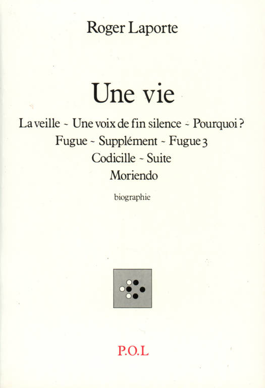 Une Vie reprend l'oeuvre biographique qu'a publiée Roger Laporte depuis 1963, c'est-à-dire : La Veille, Une voix de fin silence, Pourquoi ?, Fugue, Supplément, Fugue 3, Codicille, Suite, Moriendo. On peut y lire le récit de la vie d'un homme qui s'engage entièrement dans l'aventure de l'écriture. "Au départ, dit Roger Laporte, il n'y avait rien à raconter, car on ne saurait faire le récit d'une histoire qui n'a pas encore eu lieu, d'une vie inouïe à laquelle seul écrire permettrait d'accéder."