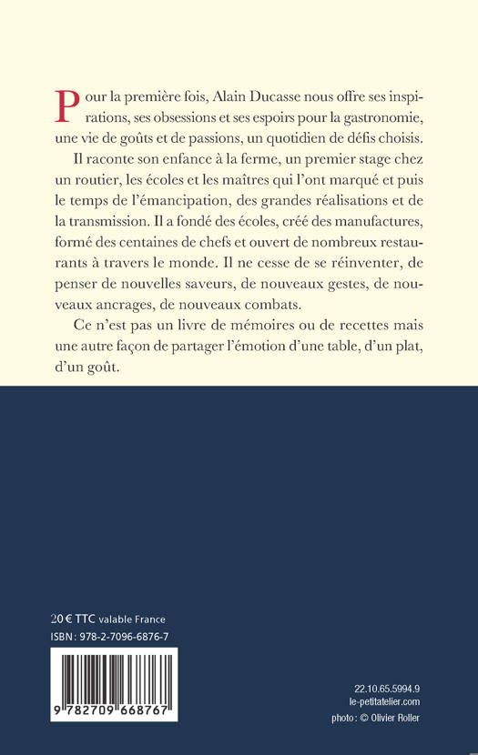 Pour la première fois, Alain Ducasse nous offre ses inspirations, ses obsessions et ses espoirs pour la gastronomie, une vie de goûts et de passions, un quotidien de défis choisis.