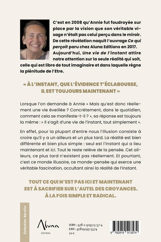 « A l’instant, que l’évidence t’éclabousse, il est toujours maintenant ». Lorsque l’on demande à Annie : « Mais qu’est donc réellement une vie éveillée ? Concrètement, dans le quotidien, comment cela se manifeste-t-il ? », sa réponse est toujours la même : « Il s’agit d’une vie de l’instant, tout simplement ». En effet, pour la plupart d’entre nous l’illusion consiste à croire qu’il y a un ailleurs et un plus tard. La réalité est bien différente et bien plus simple : seul est l’instant qui a lieu maintenant et ici. Tout le reste relève de la pensée. Cet ailleurs, ce plus tard n’existent pas réellement. Et pourtant, c’est ce monde illusoire, ce monde-pensée qui exerce une véritable fascination, occultant ainsi la réalité de l’instant.