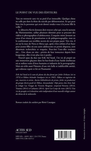 Tara est retrouvée sans vie au pied d'un immeuble. Quelque chose ne colle pas dans la thèse du suicide par défenestration. Et qui peut bien être la personne qui avait donné rendez-vous à la jeune fille la veille ? Le détective Kevin Jonsson doit trouver celui qui, sous le surnom du Marionnettiste, utilise plusieurs identités pour se procurer des vidéos et photographies d'adolescentes. L'enquête mène Jonsson au coeur d'un réseau de prostitution et de pédopornographie, tout en le confrontant aux terribles secrets de son propre passé. Très vite, il est sur la trace de Nova et Mercy qui, après s'être enfuies d'un foyer pour jeunes filles où une autre adolescente est portée disparue, sont désormais recherchées et traquées. Peut-être l'ont-elles toujours été... Une chose est sûre : privées de leur innocence depuis bien longtemps, elles n'ont plus rien à perdre. Nouvel opus du duo star Erik Axl Sund, Une vie de poupée est une immersion glaçante dans les bas-fonds d'une Suède ténébreuse où se mêlent traite d'êtres humains et industrie de la pornographie. Mais où éclôt aussi l'histoire d'une très belle et indéfectible amitié, qui redonne espoir et foi en l'humanité.