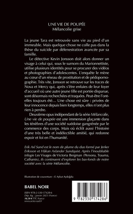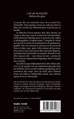 La jeune Tara est retrouvée sans vie au pied d'un immeuble. Mais quelque chose ne colle pas dans la thèse du suicide par défenestration avancée par sa famille. Le détective Kevin Jonsson doit alors donner un visage à celui qui, sous le surnom du Marionnettiste, utilise plusieurs identités pour se procurer des vidéos et photographies d'adolescentes. L'enquête le mène au coeur d'un réseau de prostitution et de pédopornographie. Très vite, Jonsson se retrouve sur les traces de Nova et Mercy qui, après s'être enfuies de leur foyer d'accueil où une autre jeune fille est portée disparue, sont désormais recherchées et traquées. Peut- être l'ont-elles toujours été... Une chose est sûre : privées de leur innocence depuis bien longtemps, elles n'ont plus rien à perdre. Deuxième opus indépendant de la série "Mélancolie", "Une vie de poupée" est une immersion glaçante dans les ténèbres d'une société suédoise gangrénée par le commerce des corps. Mais où éclôt aussi l'histoire d'une très belle et indéfectible amitié, qui redonne espoir et foi en l'humanité.