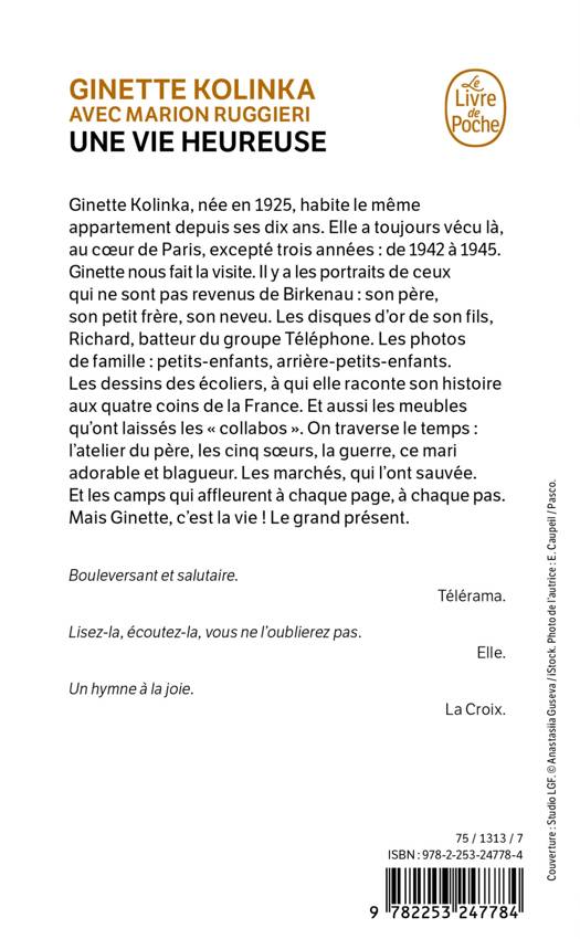 Ginette Kolinka, née en 1925, habite le même appartement depuis qu’elle a dix ans. Elle a toujours vécu là, au cœur de Paris, à l’exception de trois ans : de 1942 à 1945. Ginette nous fait la visite. Il y a les portraits de ceux qui ne sont pas revenus de Birkenau : son père, son petit frère, son neveu. Les disques d’or de son fils, Richard, batteur du groupe Téléphone. Les photos de famille : petits-enfants, arrière-petits-enfants. Les dessins des écoliers, à qui elle raconte son histoire aux quatre coins de la France. Et même les meubles qu’ont laissés les « collabos ». On traverse le temps : l’atelier du père, les cinq sœurs, la guerre, ce mari adorable et blagueur. Les marchés, qui l’ont sauvée. Et les camps qui affleurent à chaque page, à chaque pas. Mais Ginette, c’est la vie ! Le grand présent.