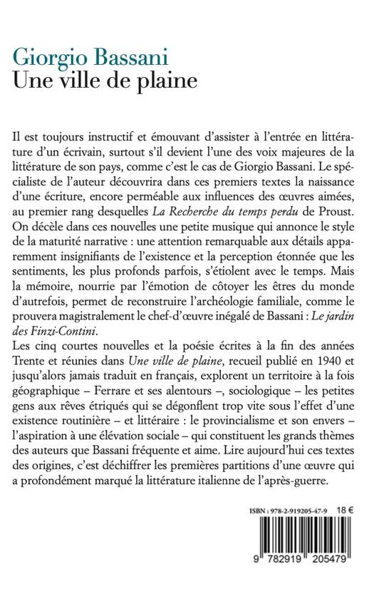 Il est toujours instructif et émouvant d'assister à l'entrée en littérature d'un écrivain, surtout s'il devient l'une des voix majeures de la littérature de son pays, comme c'est le cas de Giorgio Bassani. Le spécialiste de l'auteur découvrira dans ces premiers textes la naissance d'une écriture, encore perméable aux influences des oeuvres aimées, au premier rang desquelles La Recherche du temps perdu de Proust. On décèle dans ces nouvelles une petite musique qui annonce le style de la maturité narrative : une attention remarquable aux détails apparemment insignifiants de l'existence et la perception étonnée que les sentiments, les plus profonds parfois, s'étiolent avec le temps. Mais la mémoire, nourrie par l'émotion de côtoyer les êtres du monde d'autrefois, permet de reconstruire l'archéologie familiale, comme le prouvera magistralement le chef-d'oeuvre inégalé de Bassani : Le jardin des Finzi-Contini. Les cinq courtes nouvelles et la poésie écrits à la fin des années Trente et réunis dans Une ville de plaine, recueil publié en 1940 et jusqu'alors jamais traduit en français, explorent un territoire à la fois géographique -et Ferrare et ses alentours -, sociologique - les petites gens aux rêves étriqués qui se dégonflent trop vite sous l'effet d'une existence routinière - et littéraire : le provincialisme et son envers - l'aspiration à une élévation sociale - qui constituent les grands thèmes des auteurs que Bassani fréquente et aime. Lire aujourd'hui ces textes des origines, c'est déchiffrer les premières partitions d'une oeuvre qui a profondément marqué la littérature italienne de l'après-guerre.