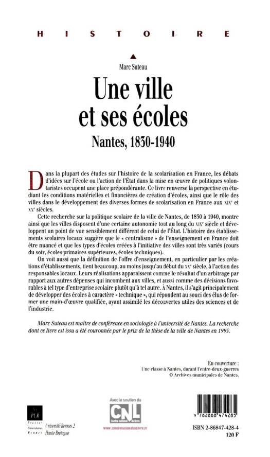 Cette recherche sur la politique scolaire de la ville de Nantes, de 1830 à 1940, montre ainsi que les villes disposent d'une certaine autonomie tout au long du XIXe siècle et développent un point de vue sensiblement différent de celui de l'État. L'histoire des établissements scolaires locaux suggère que le « centralisme » de l'enseignement en France doit être nuancé et que les types d'écoles créées à l'initiative des villes sont très variés (cours du soir, écoles primaires supérieures, écoles techniques).