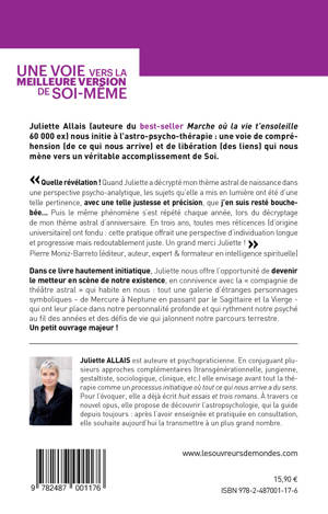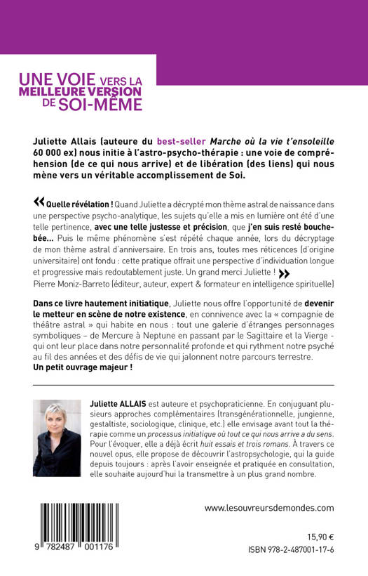 Juliette Allais (auteure du best-seller Marche où la vie t’ensoleille 60 000 ex), nous initie à l’astro-psycho-thérapie : une voie de compréhension (de ce qui nous arrive) et de libération (des liens) qui nous mène vers un véritable accomplissement de Soi. « Quelle révélation ! moi qui ne croyait pas à l’astrologie, j’en suis tombé de ma chaise ! Quand Juliette m’a fait la lecture psycho-analytique de mon thème astral de naissance, les sujets qu’elle a mis en lumière ont été d’une telle pertinence, avec une telle justesse et précision, que j’en suis resté bouche-bée… Mais le même phénomène s’est répété chaque année, lors du décryptage de mon thème astral d’anniversaire ! Toutes mes réticences (d’origine universitaire) ont fondu, et nos échanges ont ensuite modifié ma compréhension du monde et de ses mystères, et m’ont amené à voir autrement la notion d’’accomplissement de Soi. Un grand merci Juliette ! » Pierre Moniz-Barreto (auteur, éditeur, formateur spirituel). Dans ce livre hautement initiatique, Juliette nous offre l’opportunité de devenir le metteur en scène de notre existence, en connivence avec la compagnie de théâtre astral qui habite en nous : tout une galerie d’étranges personnages symboliques – de Mercure à Neptune en passant par le Sagittaire et la Vierge - qui ont leur place dans notre personnalité profonde et qui rythment notre psyché au fil des années et des défis de vie qui jalonnent notre parcours terrestre. Un petit ouvrage majeur.