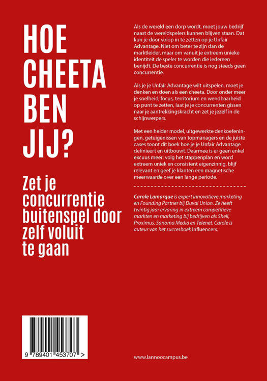 Als je je Unfair Advantage wilt uitspelen, moet je denken en doen als een cheeta. Door onder meer je snelheid, focus, territorium en wendbaarheid op punt te zetten, laat je je concurrenten gissen naar je aantrekkingskracht en zet je jezelf in de schijnwerpers.