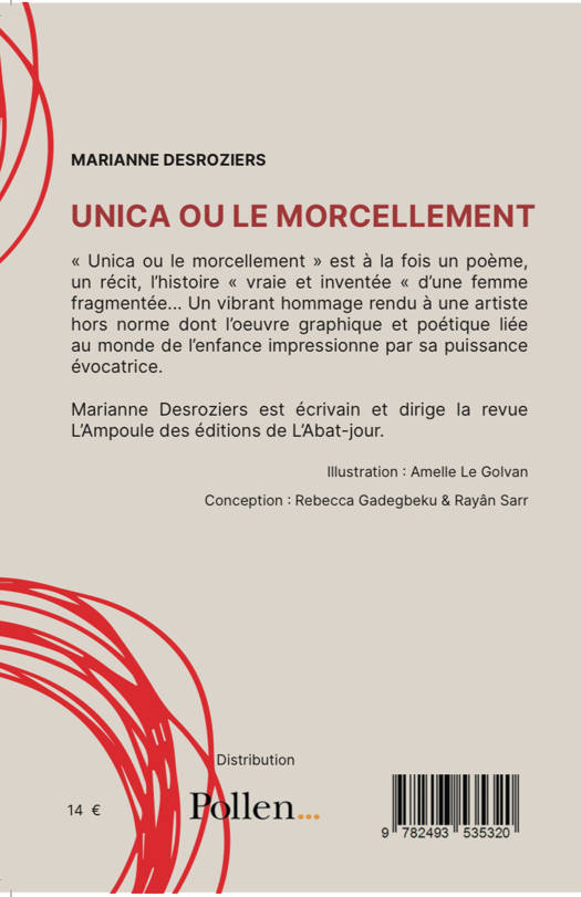 "unicA ou le morcellement" est un hommage rendu à l'artiste-écrivaine Unica Zurn, compagne de Hans Bellmer et égérie des surréalistes. Dans une langue singulière et poétique, l'auteure nous entraine dans les dédales d'un esprit certes tourmenté mais ô combien créatif, auteure entre autres de "L'homme-jasmin", récit d'une puissance poétique rare, et d'une oeuvre graphique riche...