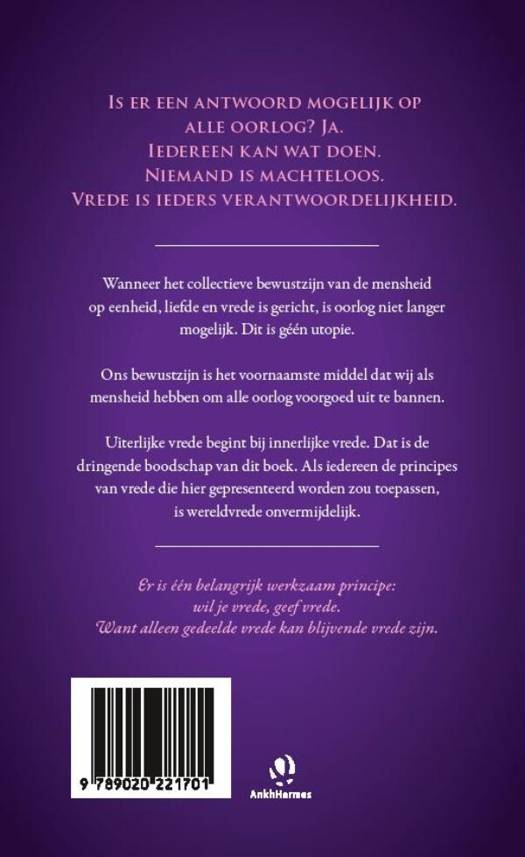 Vrede is een direct gevolg van eenheid, zoals oorlog een direct gevolg van afscheiding is. Tussen gelijken kan er geen oorlog zijn. Er gaat altijd veroordeling van de andere partij aan vooraf. Als mensheid hebben we vooral ons bewustzijn als tegenkracht tegen de oorlog van machthebbers. Dit boek brengt dat bewustzijn in beeld, geeft veel principes van vrede, en laat voelen dat we niet machteloos zijn. Wil je vrede, geef vrede. Want alleen gedeelde vrede kan blijvende vrede zijn, en alleen gezamenlijke veiligheid is echte veiligheid. Uit: 'Universele vrede' "Vrede is vóór alles innerlijke vrede. In het andere geval blijf je je innerlijke onvrede projecteren op alles om je heen. Een staat van innerlijke vrede straalt naar buiten uit en bewerkstelligt uiterlijke vrede. De mensen om jou heen ontvangen jouw innerlijke vrede en delen die. Zo verspreidt vrede zich over de wereld. Oorlog voorkomen is elkaars belangen als je eigen belangen zien. Een gemeenschappelijk belang leidt nooit tot oorlog en altijd tot vrede. Zo'n basaal gemeenschappelijk belang is dat beide volkeren, beide partijen, in vrede en veiligheid willen leven en zo hun kinderen willen grootbrengen."