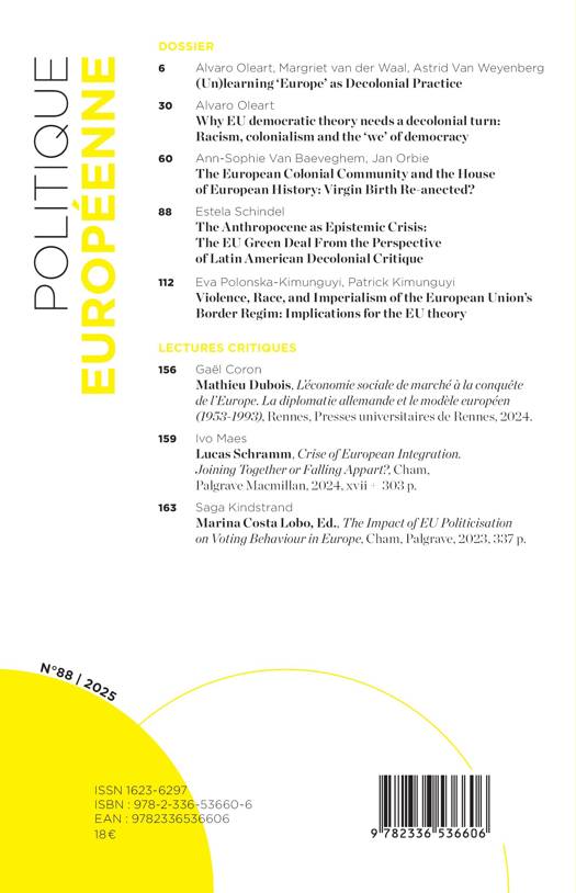 Une réflexion critique sur l’Europe à partir d’une perspective décoloniale. Les contributions interrogent la manière dont l’Europe s’est historiquement pensée, construite et imposée comme centre politique, culturel et épistémique du monde, souvent en occultant ou en minimisant les héritages du colonialisme et de l’impérialisme.