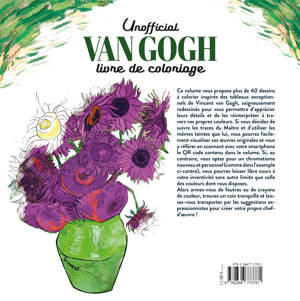 Ce volume vous permet d’affiner votre créativité et de marcher sur les pas de Vincent van Gogh en ajoutant votre touche personnelle aux dessins tirés de ses oeuvres les plus célèbres. Grâce aux 38 illustrations (en simple et double page) le lecteur pourra se plonger dans l’univers d’un maître de la peinture et choisir de défier van Gogh, sur son propre terrain en essayant de colorier avec les mêmes couleurs que lui (en utilisant un QR code qui renvoie aux oeuvres originales) ou bien de se lancer un défi en laissant libre cours à ses compétences artistiques en appliquant les couleurs selon son goût pour créer son propre chef-d’oeuvre !