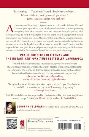 Now a Netflix original series! Unorthodox is the bestselling memoir of a young Jewish woman's escape from a religious sect, in the tradition of Ayaan Hirsi Ali's Infidel and Carolyn Jessop's Escape, featuring a new epilogue by the author.As a member of the strictly religious Satmar sect of Hasidic Judaism, Deborah Feldman grew up under a code of relentlessly enforced customs governing everything from what she could wear and to whom she could speak to what she was allowed to read. Yet in spite of her repressive upbringing, Deborah grew into an independent-minded young woman whose stolen moments reading about the empowered literary characters of Jane Austen and Louisa May Alcott helped her to imagine an alternative way of life among the skyscrapers of Manhattan. Trapped as a teenager in a sexually and emotionally dysfunctional marriage to a man she barely knew, the tension between Deborah's desires and her responsibilities as a good Satmar girl grew more explosive until she gave birth at nineteen and realized that, regardless of the obstacles, she would have to forge a path--for herself and her son--to happiness and freedom. Remarkable and fascinating, this "sensitive and memorable coming-of-age story" (Pittsburgh Post-Gazette) is one you won't be able to put down.