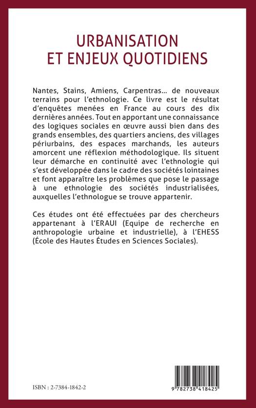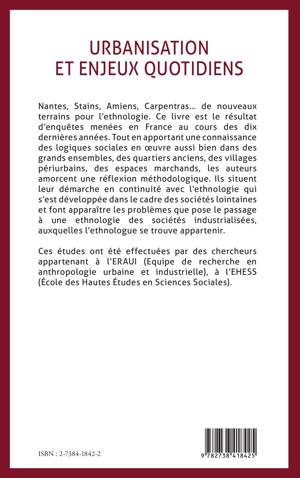 Nantes, Stains, Amiens, Carpentras... de nouveaux terrains pour l'ethnologie. Ce livre est le résultat d'enquêtes menées en France au cours des dix dernières années. Tout en apportant une connaissance des logiques sociales en oeuvre aussi bien dans des grands ensembles, des quartiers anciens, des villages périurbains, des espaces marchands..., les auteurs amorcent une réflexion méthodologique. Ils situent leur démarche en continuité avec l'ethnologie qui s'est développée dans le cadre des sociétés lointaines et font apparaître les problèmes que pose le passage à une l'ethnologie des sociétés industrialisées, auxquelles l'ethnologue se trouve appartenir.