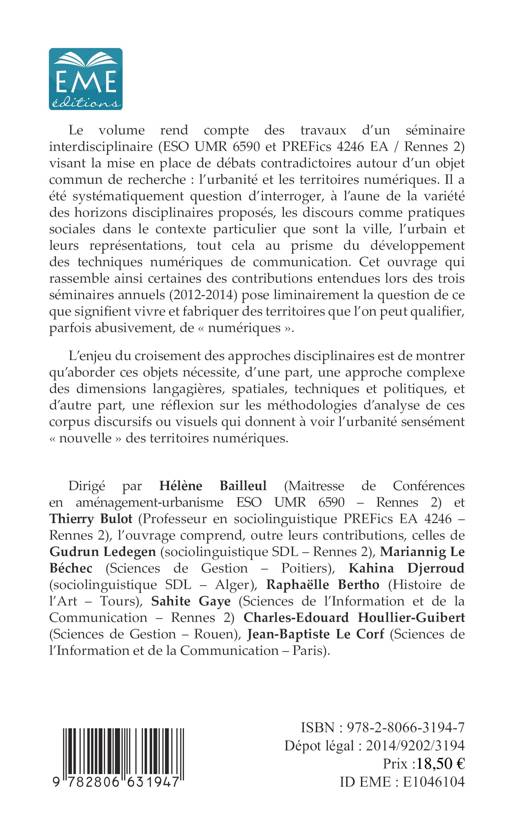 Le volume rend compte des travaux d'un séminaire interdisciplinaire (ESO UMR 6590 et PREFics 4246 EA / Rennes 2) visant la mise en place de débats contradictoires autour d'un objet commun de recherche : l'urbanité et les territoires numériques. Il a été systématiquement question d'interroger, à l'aune de la variété des horizons disciplinaires proposés, les discours comme pratiques sociales dans le contexte particulier que sont la ville, l'urbain et leurs représentations…