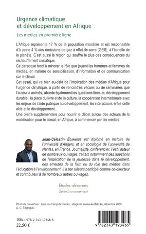 L'Afrique représente 17 % de la population mondiale et est responsable d'à peine 4 % des émissions de gaz à effet de serre, à l'échelle de la planète. C'est aussi la région qui souffre le plus des conséquences du réchauffement climatique. Ce paradoxe tend à minorer le rôle que jouent les hommes et femmes de médias, en matière de sensibilisation, d'information et de communication sur le climat. Cet essai, qui va bien au-delà de l'implication des médias d'Afrique pour l'urgence climatique, aborde également les questions liées au développement durable : la place du livre et de la culture, la coopération internationale avec les enjeux de l'aide publique au développement, les interactions entre cette aide et le développement.