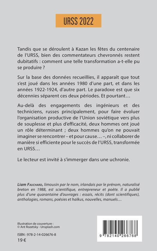 Tandis que se déroulent à Kazan les fêtes du centenaire de l'URSS, bien des commentateurs chevronnés restent dubitatifs : comment une telle transformation a-t-elle pu se produire ? Sur la base des données recueillies, il apparaît que tout s'est joué dans les années 1980 d'une part, et dans les années 1922-1924, d'autre part. Le paradoxe est que six décennies séparent ces deux périodes. Et pourtant... Au-delà des engagements des ingénieurs et des techniciens, russes principalement, pour faire évoluer l'organisation productive de l'Union soviétique vers plus de souplesse et plus d'efficacité, deux hommes ont jouéun rôle déterminant ; deux hommes qu'on ne pouvait imaginer se rencontrer - et pour cause...-, ni collaborer de manière si efficiente pour le succès de l'URSS, transformée en URSS... Le lecteur est invité à s'immerger dans une uchronie.