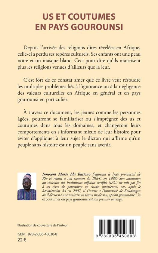Depuis l'arrivée des religions dites révélées en Afrique, celle-ci a perdu ses repères culturels. Ses enfants ont une peau noire et un masque blanc. Ceci pour dire qu'ils maitrisent plus les religions venues d'ailleurs que la leur. C'est fort de ce constat amer que ce livre veut résoudre les multiples problèmes liés à l'ignorance ou à la négligence des valeurs culturelles en Afrique en général et au pays gourounsi en particulier. À travers ce document, les jeunes comme les personnes âgées, pourront se familiariser ou s'imprégner des us et coutumes dans tous les domaines, et changeront leurs comportements ens'informant mieux de leur histoire pour éviter d'appliquer à leur sujet ledicton qui affirme qu'un peuple sans histoire est un peuple sans avenir.