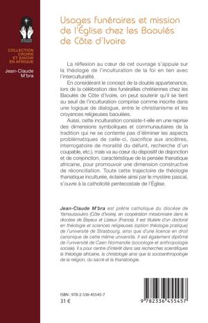 La réflexion au coeur de cet ouvrage s'appuie sur la théologie de l'inculturation de la foi en lien avec l'interculturalité. En considérant le concept de la double appartenance, lors de la célébration des funérailles chrétiennes chez les Baoulés de Côte d'Ivoire, on peut soutenir qu'il se tient au seuil de l'inculturation comprise comme inscrite dans une logique de dialogue, entre le christianisme et les croyances religieuses baoulées. Aussi, cette inculturation consiste-t-elle en une reprise des dimensions symboliques et communautaires de la tradition qui ne se contente pas d'éliminer les aspects problématiques de celle-ci, (sacrifice aux ancêtres, interrogatoire de moralité du défunt, recherche d'un coupable, etc.), mais va au coeur du dispositif de disjonction et de conjonction, caractéristique de la pensée thanatique africaine, pour promouvoir une dimension constructive de réconciliation. Toute cette trajectoire de théologie thanatique inculturée, éclairée ainsi par le mystère pascal, s'ouvre à la catholicité pentecostale de l'Église.