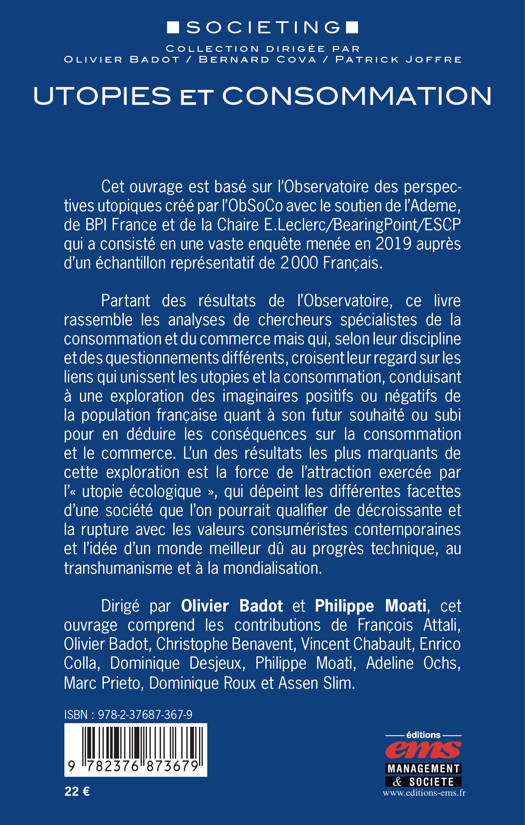 Cet ouvrage est basé sur l'Observatoire des perspectives utopiques créé par l'ObSoCo avec le soutien de l'Ademe, de BPI France et de la Chaire E.Leclerc/BearingPoint/ESCP qui a consisté en une vaste enquête menée en 2019 auprès d'un échantillon représentatif de 2 000 Français. Partant des résultats de l'Observatoire, ce livre rassemble les analyses de chercheurs spécialistes de la consommation et du commerce mais qui, selon leur discipline et des questionnements différents, croisent leur regard sur les liens qui unissent les utopies et la consommation, conduisant à une exploration des imaginaires positifs ou négatifs de la population française quant à son futur souhaité ou subi pour en déduire les conséquences sur la consommation et le commerce. L'un des résultats les plus marquants de cette exploration est la force de l'attraction exercée par l'« utopie écologique », qui dépeint les différentes facettes d'une société que l'on pourrait qualifier de décroissante et la rupture avec les valeurs consuméristes contemporaines et l'idée d'un monde meilleur dû au progrès technique, au transhumanisme et à la mondialisation. Dirigé par Olivier Badot et Philippe Moati, cet ouvrage comprend les contributions de François Attali, Olivier Badot, Christophe Benavent, Vincent Chabault, Enrico Colla, Dominique Desjeux, Philippe Moati, Adeline Ochs, Marc Prieto, Dominique Roux et Assen Slim.
