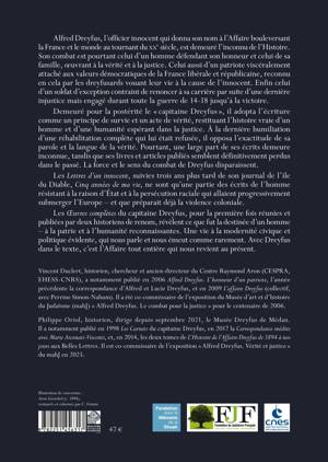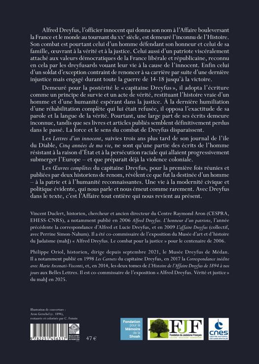 Alfred Dreyfus, l'officier innocent qui donna son nom a l'Affaire bouleversant la France et le monde au tournant du XXe siecle, est demeure l'inconnu de l'Histoire. Son combat est pourtant celui d'un homme defendant son honneur et celui de sa famille, oeuvrant a la verite et a la justice. Celui aussi d'un patriote visceralement attache aux valeurs democratiques de la France liberale et republicaine, reconnu en cela par les dreyfusards vouant leur vie a la cause de l'innocent. Enfin celui d'un soldat d'exception contraint de renoncer a sa carriere par suite d'une derniere injustice mais engage durant toute la guerre de 14-18 jusqu'a la victoire. Demeure pour la posterite le " capitaine Dreyfus ", il adopta l'ecriture comme un principe de survie et un acte de verite, restituant l'histoire vraie d'un homme et d'une humanite esperant dans la justice. A la derniere humiliation d'une rehabilitation complete qui lui etait refusee, il opposa l'exactitude de sa parole et la langue de la verite. Pourtant, une large part de ses ecrits demeure inconnue, tandis que ses livres et articles publies semblent definitivement perdus dans le passe. La force et le sens du combat de Dreyfus disparaissent. Les Lettres d'un innocent, suivies trois ans plus tard de son journal de l'ile du Diable, Cinq annees de ma vie, ne sont qu'une partie des ecrits de l'homme resistant a la raison d'Etat et a la persecution raciale qui allaient progressivement submerger l'Europe - et que preparait deja la violence coloniale. Les OEuvres completes du capitaine Dreyfus, pour la premiere fois reunies et publiees par deux historiens de renom, revelent ce que fut la destinee d'un homme - a la patrie et a l'humanite reconnaissantes. Une vie a la modernite civique et politique evidente, qui nous parle et nous emeut comme rarement. Avec Dreyfus dans le texte, c'est l'Affaire tout entiere qui nous revient au present. Vincent Duclert, historien, chercheur et ancien directeur du Centre Raymond Aron (CESPRA, EHESS-CNRS), anotamment publie en 2006 Alfred Dreyfus. L'honneur d'un patriote, l'annee precedente la correspondance d'Alfred et Lucie Dreyfus, et en 2009 L'affaire Dreyfus (collectif, avec Perrine Simon-Nahum). Il a ete co-commissaire de l'exposition du Musee d'art et d'histoire du Judaisme (mahJ) " Alfred Dreyfus. Le combat pour la justice " pour le centenaire de 2006. Philippe Oriol, historien, dirige depuis septembre 2021, le Musee Dreyfus de Medan. Il a notamment publie en 1998 Les Carnets du capitaine Dreyfus, en 2017 la Correspondance inedite avec Marie Arconati-Visconti, et, en 2014, les deux tomes de L'Histoire de l'Affaire Dreyfus de 1894 a nos jours aux Belles Lettres. Il est co-commissaire de l'exposition " Alfred Dreyfus. Verite et justice " du mahJ en 2025.