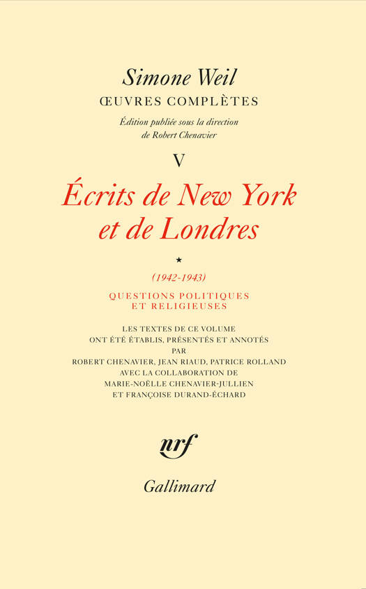 Ce volume reproduit les textes composés par Simone Weil dans la dernière année de sa vie, parallèlement à L'Enracinement, entre juillet 1942 et sa mort le 24 août 1943. Le 14 mai 1942, Simone Weil et ses parents embarquent à Marseille pour Casablanca, puis New York, où ils arrivent le 6 juillet. À côté d'articles destinés à informer le public américain sur les problèmes français, qu'elle ne parviendra pas à publier, Simone Weil poursuit sa réflexion sur les sujets philosophiques ou spirituels qui la préoccupaient à Marseille. Elle donne lieu à deux textes importants, Israël et les "Gentils" et la Lettre au père Couturier. Le premier développe son projet de "purger" le christianisme de ses références hébraïques, en promouvant au contraire sa composante hellénique. Le second expose les pensées que Simone Weil déclare porter en elle depuis des années et qui font obstacle à son adhésion à l'Église. Ayant installé ses parents aux États-Unis, Simone Weil quitte New York pour Londres, qu'elle rejoint le 14 décembre 1942. Elle devient "rédactrice" dans les services de la France Libre. En dépit de leur caractère conjoncturel, lié aux circonstances de la guerre, les écrits de cette période esquissent "les grandes lignes d'une doctrine", comme l'avait justement souligné Simone Pétrement. Qu'il s'agisse de sa fameuse Note sur la suppression générale des partis politiques, de ses réflexions sur la nature de la guerre, sur la question coloniale, sur le statut de la minorité juive ou sur la constitution à envisager pour l'après-guerre, ils témoignent de son souci constant de redonner une inspiration spirituelle à la politique. En quoi ils rejoignent les thèmes de L'Enracinement.