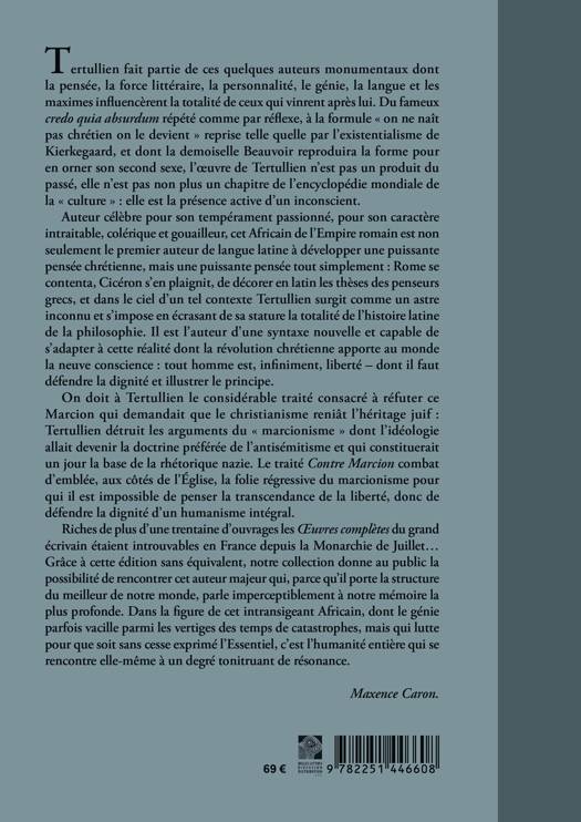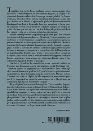 Tertullien fait partie de ces quelques auteurs monumentaux dont la pensee, la force litteraire, la personnalite, le genie, la langue et les maximes influencerent la totalite de ceux qui vinrent apres lui. Du fameux credo quia absurdum repete comme par reflexe, a la formule on ne nait pas chretien on le devient reprise telle quelle par l'existentialisme de Kierkegaard, et dont la demoiselle Beauvoir reproduira la forme pour en orner son second sexe, l'oeuvre de Tertullien n'est pas un produit du passe, elle n'est pas non plus un chapitre de l'encyclopedie mondiale de la culture elle est la presence active d'un inconscient. Auteur celebre pour son temperament passionne, pour son caractere intraitable, colerique et gouailleur, cet Africain de l'Empire romain est non seulement le premier auteur de langue latine a developper une puissante pensee chretienne, mais une puissante pensee tout simplement: Rome se contenta, Ciceron s'en plaignit, de decorer en latin les theses des penseurs grecs, et dans le ciel d'un tel contexte Tertullien surgit comme un astre inconnu et s'impose en ecrasant de sa stature la totalite de l'histoire latine de la philosophie. Il est l'auteur d'une syntaxe nouvelle et capable de s'adapter a cette realite dont la revolution chretienne apporte au monde la neuve conscience: tout homme est, infiniment, liberte - dont il faut defendre la dignite et illustrer le principe. On doit a Tertullien le considerable traite consacre a refuter ce Marcion qui demandait que le christianisme reniat l'heritage juif: Tertullien detruit les arguments du marcionisme dont l'ideologie allait devenir la doctrine preferee de l'antisemitisme et qui constituerait un jour la base de la rhetorique nazie. Le traite Contre Marcion combat d'emblee, aux cotes de l'Eglise, la folie regressive du marcionisme pour qui il est impossible de penser la transcendance de la liberte, donc de defendre la dignite d'un humanisme integral. Riches de plus d'une trentaine d'ouvrages les OEuvres completes du grand ecrivain etaient introuvables en France depuis la Monarchie de Juillet... Grace a cette edition sans equivalent, notre collection donne au public la possibilite de rencontrer cet auteur majeur qui, parce qu'il porte la structure du meilleur de notre monde, parle imperceptiblement a notre memoire la plus profonde. Dans la figure de cet intransigeant Africain, dont le genie parfois vacille parmi les vertiges des temps de catastrophes, mais qui lutte pour que soit sans cesse exprime l'Essentiel, c'est l'humanite entiere qui se rencontre elle-meme a un degre tonitruant de resonance.