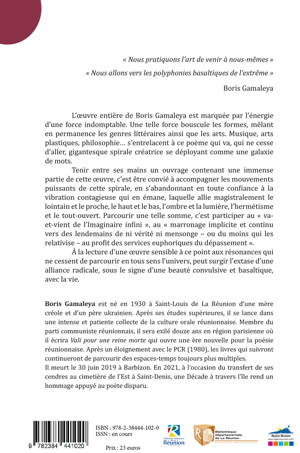 L’œuvre entière de Boris Gamaleya est marquée par l’énergie d’une force indomptable. Une telle force bouscule les formes, mêlant en permanence les genres littéraires ainsi que les arts. Musique, arts plastiques, philosophie… s’entrelacent à ce poème qui va, qui ne cesse d’aller, gigantesque spirale créatrice se déployant comme une galaxie de mots. Tenir entre ses mains un ouvrage contenant une immense partie de cette œuvre, c’est être convié à accompagner les mouvements puissants de cette spirale, en s’abandonnant en toute confiance à la vibration contagieuse qui en émane, laquelle allie magistralement le lointain et le proche, le haut et le bas, l’ombre et la lumière, l’hermétisme et le tout-ouvert. Parcourir une telle somme, c’est participer au « va-et-vient de l’Imaginaire infini », au « marronage implicite et continu vers des lendemains de ni vérité ni mensonge – ou du moins qui les relativise – au profit des services euphoriques du dépassement ». À la lecture d’une œuvre sensible à ce point aux résonances qui ne cessent de parcourir en tous sens l’univers, peut surgir l’extase d’une alliance radicale, sous le signe d’une beauté convulsive et basaltique, avec la vie.